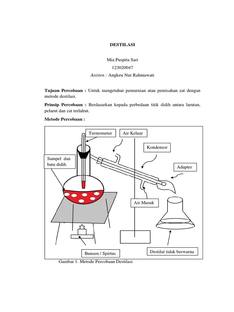 Adapun tujuan dari praktikum ini adalah sebagai berikut : Menurut ketaren (1987) metode destilasi minyak atsiri salah satunya adalah destilasi stahl,. Dasar teori protein (asal kata protos dari bahasa yunani yang berarti "yang paling utama") adalah senyawa organik kompleks berbobot molekul… destilasi sederhana merupakan proses penguapan yang diikuti pengembunan. Proses destillasi dengan tekanan dibawah tekanan atmosfer.